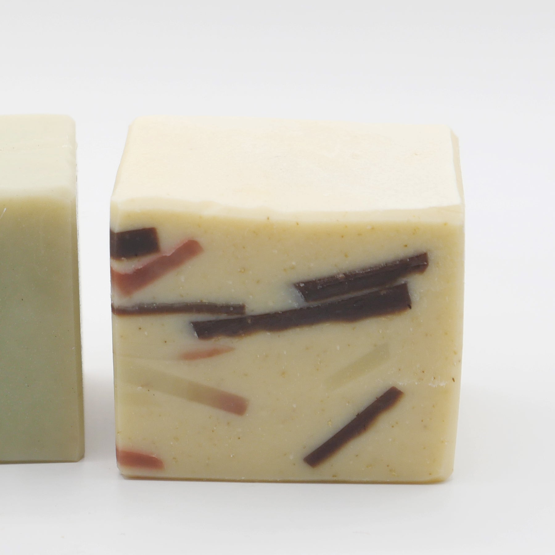Sodium Cocoate, Sodium Tallowate, Aqua, Kaolin, Avena Sativa (Oat) Kernel Powder, Lavandula Angustifolia (Lavender) Flower Water, Citric Acid, cacao powder, Citrus Sinensis (Blood Orange) Peel Oil, Tocopherol, Glycerin (naturally occurring).Cedar wood oil, Rosemary oil,  Rhubarb root powder